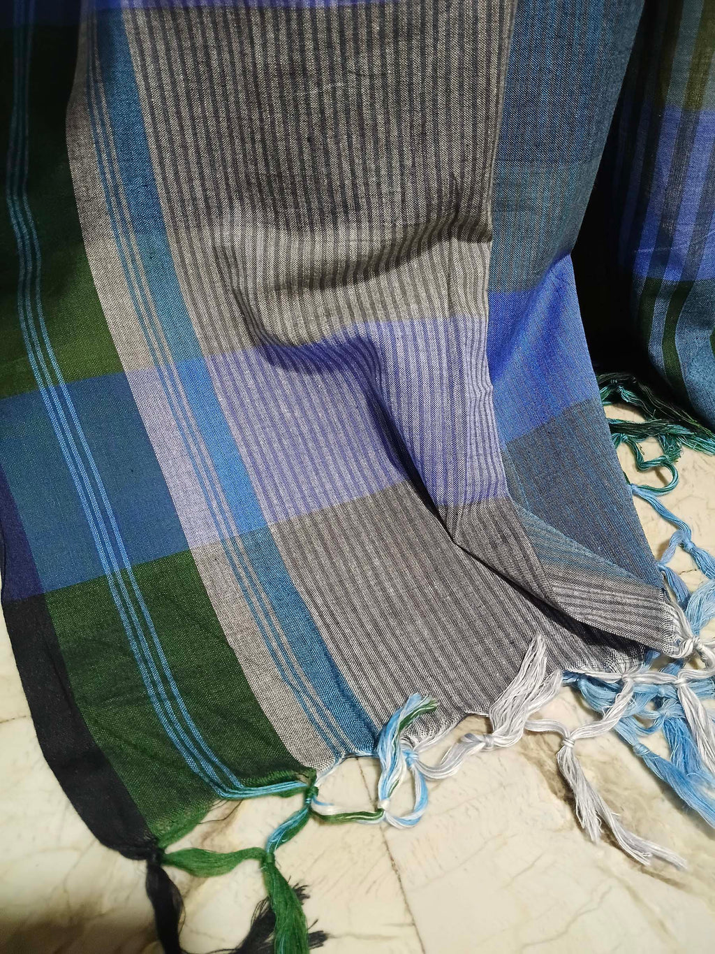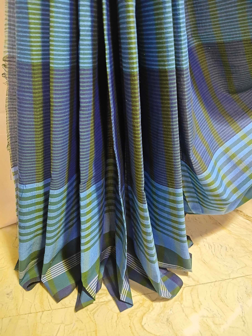 A serene reinterpretation of Bengal’s traditional Gamchha weave, this handwoven cotton saree blends layered shades of blue with deep green accents in a structured stripe composition. The body features subtle tonal variations that create depth and fluidity across the drape.