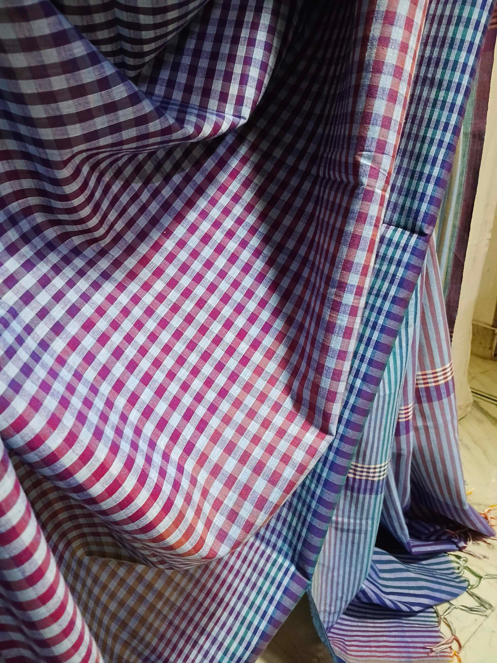 Pink and magenta check body with teal and multicolor striped pallu. Slight variations in color may occur due to lighting conditions and photography.