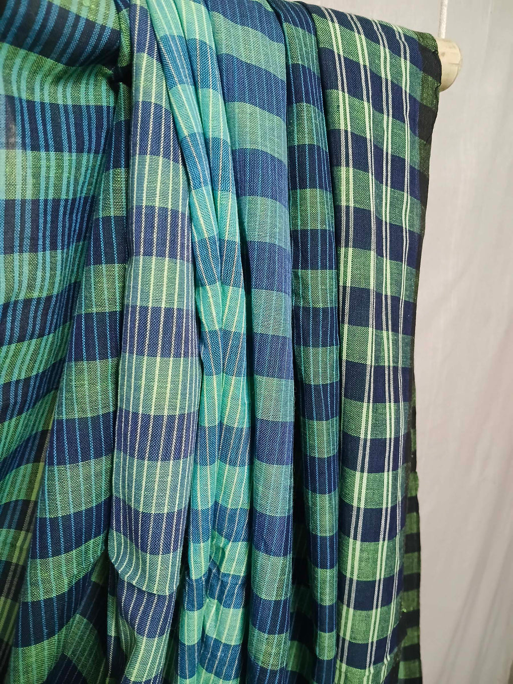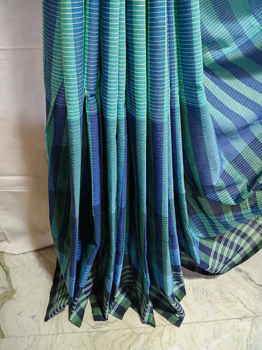 Teal, sea green, and navy striped body with structured check pallu.