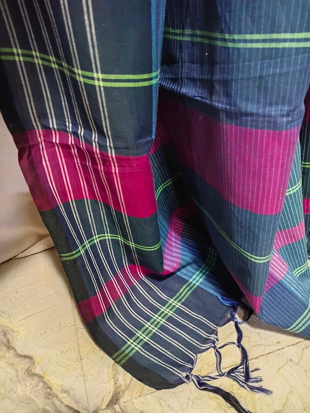 A striking blend of teal blue and magenta, this Contemporary Gamchha Cotton Saree reimagines Bengal’s traditional weaving heritage in a bold, modern palette. The body features finely structured horizontal stripes that create rhythm and movement across the drape.